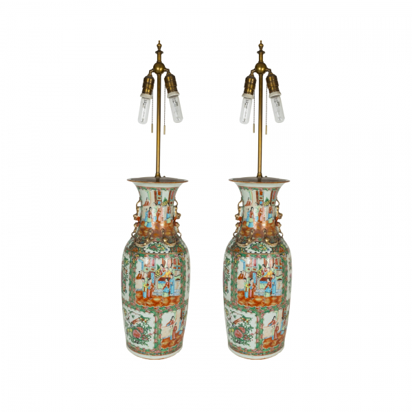 Pareja de jarrones en porcelana china Familia Rosa convertidos en lámparas, con decoración de motivos florales, dragones y escenas cortesanas en cartelas, s.XX.