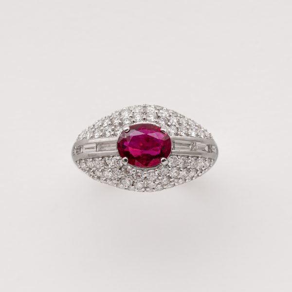 Sortija diseño bombé en oro blanco con rubí de Tailandia (Siam) talla oval custodiado por bandas de diamantes talla trapecio y cuerpo cuajado de diamantes talla brillante.
