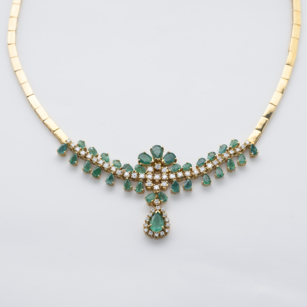 Gargantilla de eslabones rectangulares planos en oro con centro de esmeraldas talla perilla y diamantes talla brillante engastados en garras.