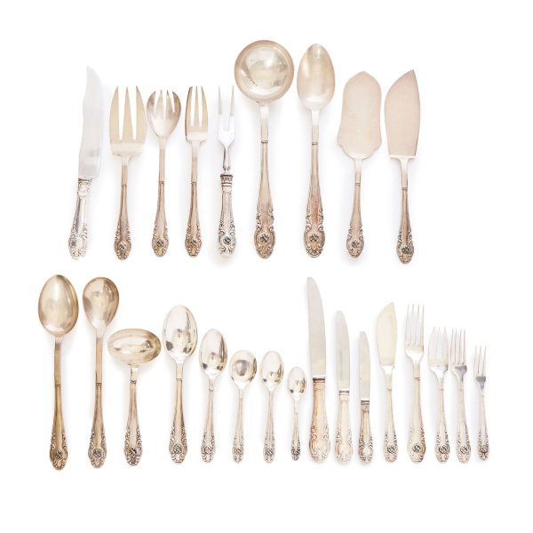 Compuesta por once cuchillos de mesa, doce tenedores de mesa, doce cucharas de mesa, doce tenedores de pescado, doce cuchillos de pescado, doce cuchillos de lunch, doce tenedores de lunch, doce cucharas de lunch, doce cuchillos de postre, doce tenedores de postre, doce cucharas de postre, doce cucharas de helado, doce cucharas de moka, un tenedor trinchante de servir, un cuchillo trinchante de servir, un cucharón, una salsera, una pala de servir postres, un tenedor de servir pescado, una pala de servir pescado, una cuchara de servir ensalada, un tenedor de servir ensalada, un tenedor de servir fuentes, una cuchara de servir fuentes y una cuchara de servir legumbres.