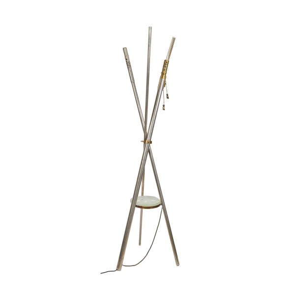 Lámpara de pie en acero cromado y latón con repisa en cristal esmerilado.