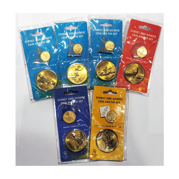 Monedas Australia, 5 Dólares, año 2000. Colección de 6 set con moneda y pin de las Olimpiadas de Sydney.
