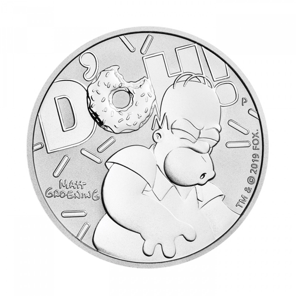 Moneda Tuvalu, 1 dólar de plata, año 2019. Homer Simpson y Reina Isabel II.