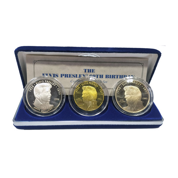 Monedas Marshall, 5,10 y 50 Dólares, año 1995. Serie Elvis Presley con certificado y estuche.
