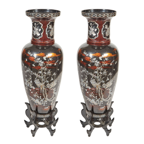 Pareja de jarrones vietnamitas en madera lacada con decoraciones incrustadas en nácar de motivos vegetales, florales y de aves fénix, c.1960.