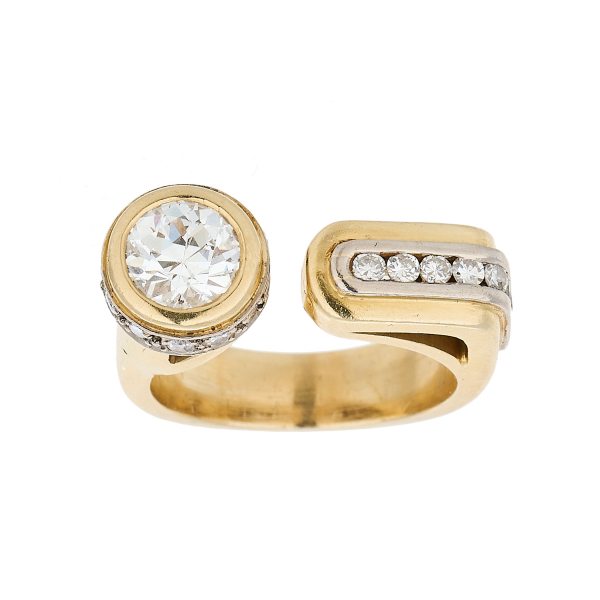 Sortija en oro con centro abierto y diamantes tallas brillante y brillante antigua engastados en barras y chatón.