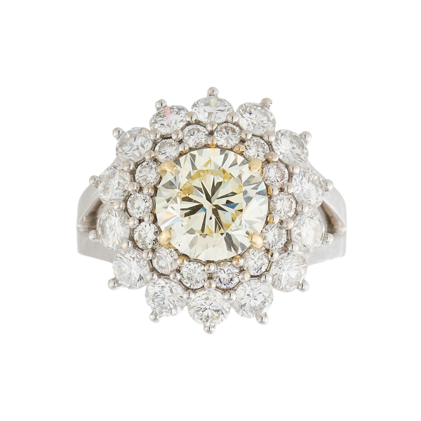 Sortija rosetón en oro blanco con centro y doble orla de diamantes talla brillante. Peso diamante pricipal: 1,91 ct. aprox.