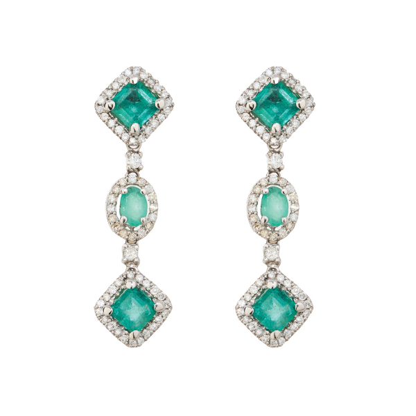 Pendientes largos en oro blanco con tres rosetones de esmeraldas tallas octógono y oval orladas y alternadas por diamantes talla brillante.