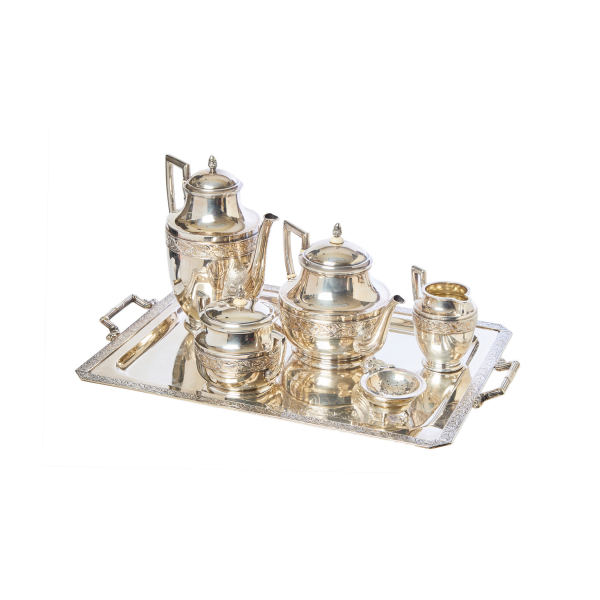 Compuesto por bandeja, cafetera, tetera, lechera, azucarera y filtro de té.