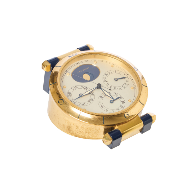 Reloj de sobremesa francés Cartier modelo «Pasha Moon Phase» en bronce dorado y acero, c.1990. Firmado y numerado 00707 al dorso.