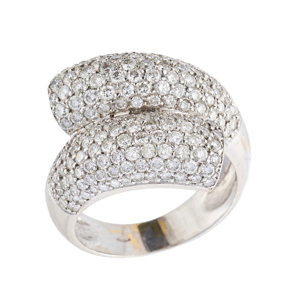 Sortija diseño bombé en oro blanco con centro cruzado de pavé de diamantes talla brillante.