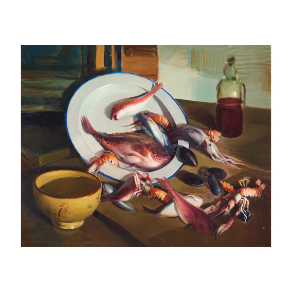 Bodegón con pescado y marisco.