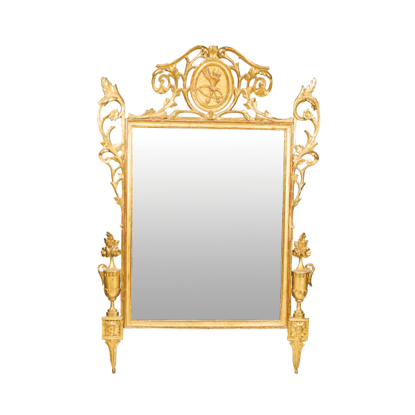 Espejo Regency en madera tallada y dorada con decoración de copas, roleos, acantos y medallón con arco y flechas, c.1835-1850.