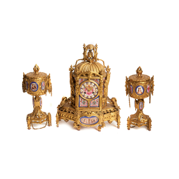 Reloj de sobremesa con guarnición de copas en bronce y placas en porcelana representando monarcas, dragones y ángeles, fles. del s.XIX.