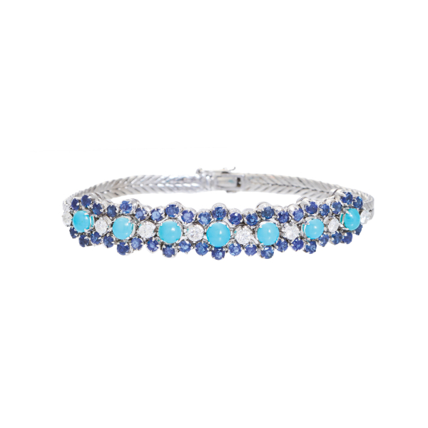 Pulsera en oro blanco con frente de diamantes talla brillante y cabujones de turquesa de 3,5 mm.enmarcados por zafiros azules talla redonda.