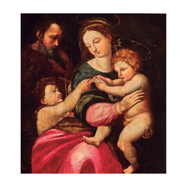 Basado en la obra «La Virgen de la rosa» de Rafael Sanzio (Urbino, Italia, 1483-Roma, Italia, 1520) realizada c.1517 y conservada en el Museo del Prado, Madrid.
