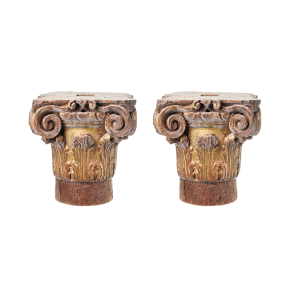 Pareja capiteles de orden corintio en madera tallada y dorada, fles. del s.XVII. Apoyan sobre pequeño pedestal de época posterior.