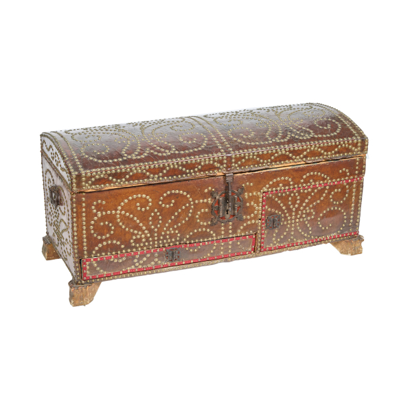 Arcón de novia en madera forrado en piel con decoración de remaches en metal, fles. del s.XVIII.