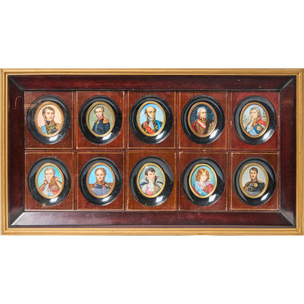Firmadas A. Vives. De izquierda a derecha: Mariscal Bertrano, Pierre Cambronne, Mariscal Persignon, Francisco I de Austria, Mariscal Angerau (Duque de Castiglione), Mariscal Victor, Alejandro I de Rusia, Duroc (Duque de Fruil), el rey de Roma y Federico Guillermo de Prusia. Enmarcadas juntas.