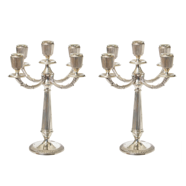 Pareja de candelabros de cinco luces en plata española punzonada con decoración gallonada, de roleos y acantos, s.XX.