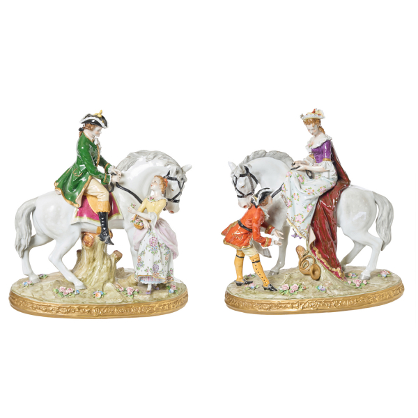 Galantes a caballo. Pareja de figuras en porcelana alemana esmaltada y parcialmente dorada, s.XIX.