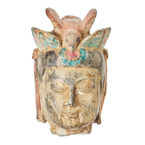 Fragmento de testa de la diosa Guanyin en piedra tallada y policromada, s.XX, sudeste asiático.