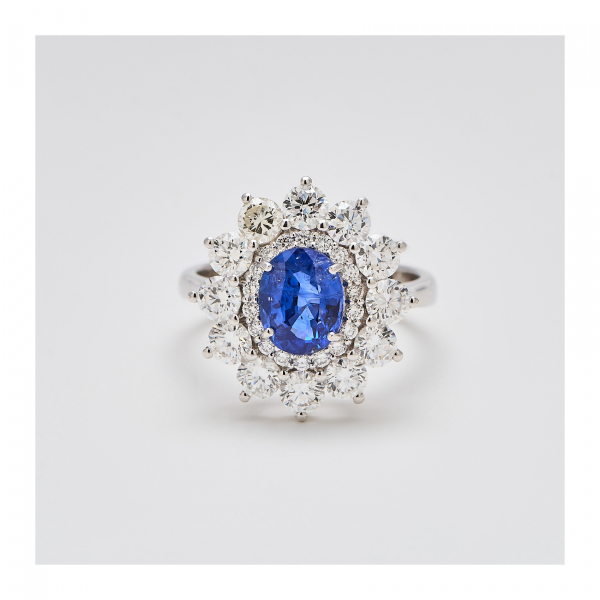 Sortija rosetón en oro blanco y zafiro azul de Sri Lanka talla oval con doble orla de diamantes talla brillante engastados en garras.