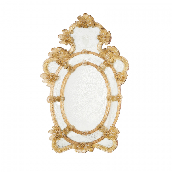 Espejo veneciano en cristal de Murano con aplicaciones rizadas y de motivos florales, c.1900-1920.
