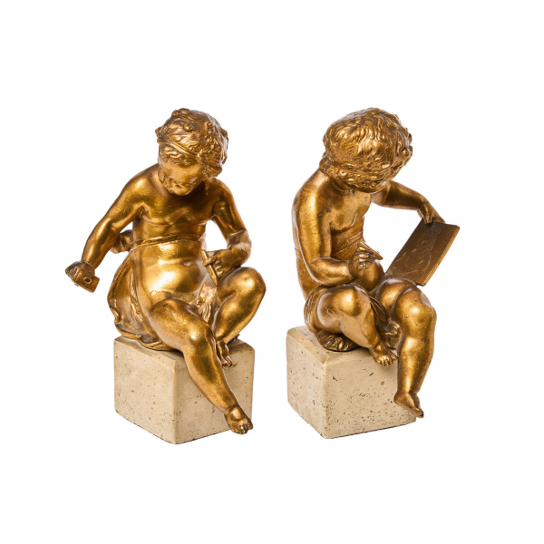 Esculturas en calamina dorada sobre peana en mármol travertino.