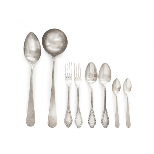 Compuesto por siete cucharas soperas, siete tenedores de mesa, seis cucharas de lunch, un cazo para sopa y una cuchara para guarnición.
