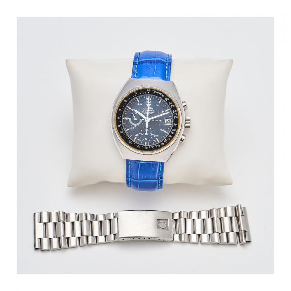 OMEGA «Speedmaster Profesional Mark IV» Reloj cronógrafo de pulsera para caballero, c. 1977. En acero y correa de piel no original (Adjunta armis de acero original).
