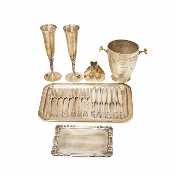 Lote de veinte piezas variadas en plata punzonada, s.XX. Compuesto por dos bandejas, dos copas para cava, una cubitera, un portavelas, siete tenedores de luch y siete cuchillos de lunch.