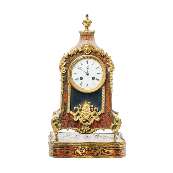Reloj de sobremesa con peana estilo Napoleon III con decoraciones en bronce dorado, latón y símil carey, s.XIX.