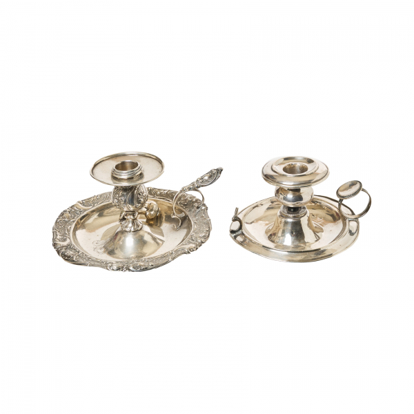 Pareja de palmatorias en plata punzonada, s.XIX. Una en plata alemana 900 mm. Otra en plata española punzonada con contrastes de Barcelona, fiel contraste B y R y platero J. Ginabreda.