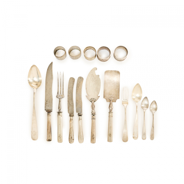 Compuesto por seis tenedores de mesa, seis cucharas soperas, seis cucharas de lunch, dos cuchillos de mesa, una cuchara de servir fuentes, un tenedor de servir carne, un cuchillo de servir carne, dos palas de servir tarta y cinco servilleteros. Presentan leves desperfectos.