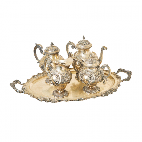 Compuesto por bandeja, cafetera, tetera, lechera y azucarera.