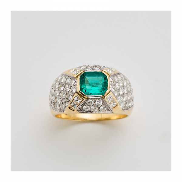 Sortija en oro con frente de diamantes talla brillante y esmeralda central de Muzo ( Colombia ) talla octogonal.