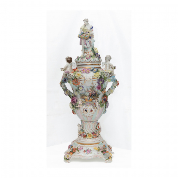 Jarrón con tapa en porcelana esmaltada alemana de Desdren con motivos florales y querubines en relieve, ppios. del s.XX.