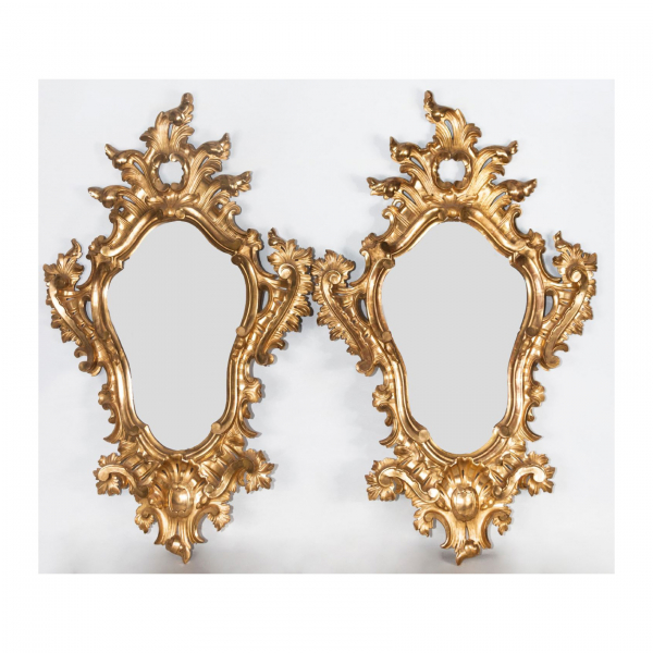 Pareja de espejos cornucopia en madera tallada y dorada con motivos de rocallas, volutas y tornapuntas, s.XIX. Cristal biselado.