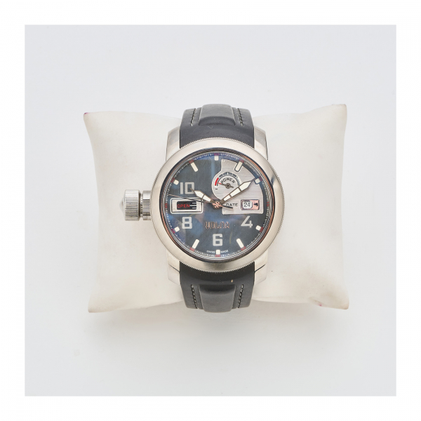 Esfera negra con varios marcadores, numeración arábiga y a trazos aplicados. Calendario fecha a las 3. Mecanismo automático.