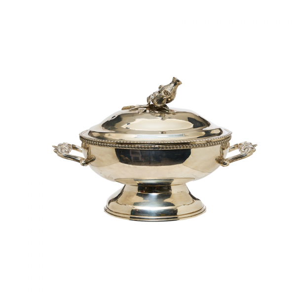 Sopera en plata punzonada 925 con decoración perimetral de cordón, roleos y motivos vegetales.