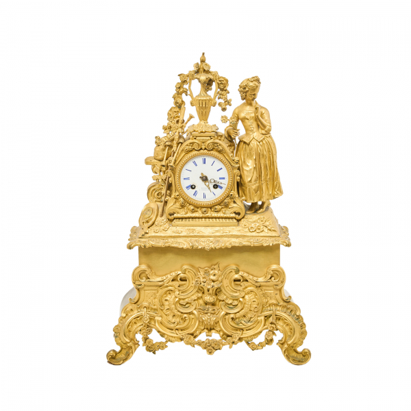 Reloj de sobremesa francés estilo Luis XVI en bronce dorado custodiado por dama con flores y decoraciones florales, de volutas y acantos, s.XIX.