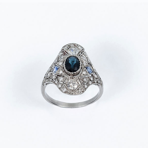 Bella sortija lanzadera estilo 'art-déco'en montura de platino, con centro de zafiro fino azul, oval, sobre motivo calado, cuajado de limpios y blancos diamantes talla brillante y un zafiro 'carré' a cada lado, en decoración grafilada.
