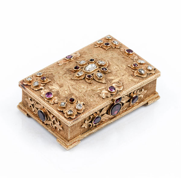 Bella caja rectangular, antigua, en sólida orfebrería de oro amarillo 18 K. Tapa y laterales con decoración grabada de flores y guirnaldas y relieves roleos, con diamantes talla rosa y talla briquet antigua, y granates, salteados, en chatón, destacando un diamante oval central.