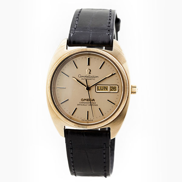 Reloj vintage, cab., suizo, OMEGA Constellation Automatic. En sólida caja de origen en oro amarillo matizado, 34 mm con bisel de estrías y relieve de observatorio astronómico en la tapa.