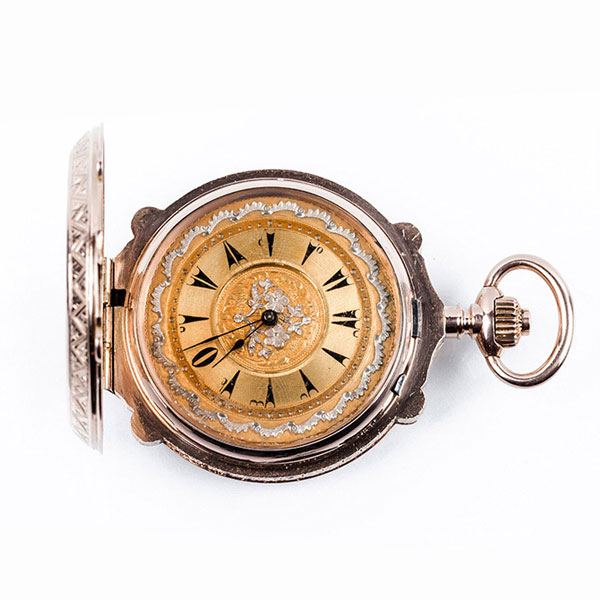 Excelente reloj saboneta, suizo, para el mercado turco, en sólida caja de oro rosa 14 K, de tres tapas, 50 mm con perfil ondulante, las exteriores en delicada decoración vegetal grabada de flores y roleos.