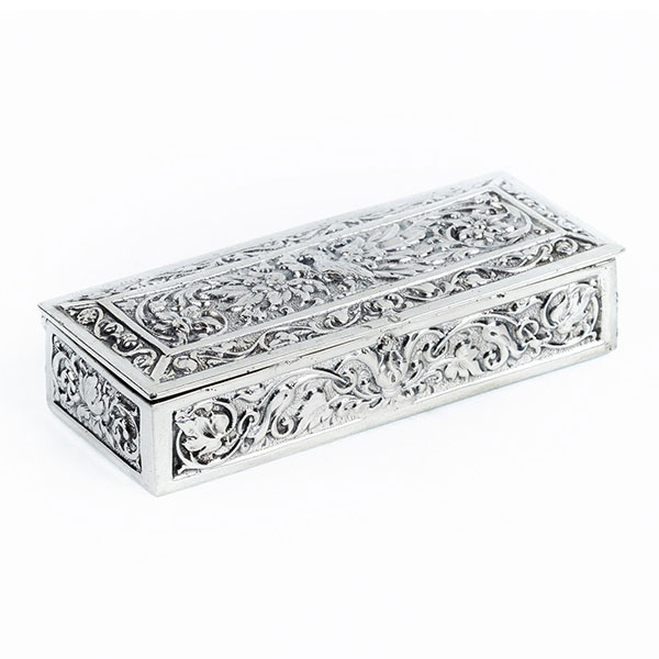 Bella caja rectangular, vintage, en plata de ley. Tapa y laterales decorados con ave, motivos vegetales, guirnaldas y roleos. Interior sobredorado.