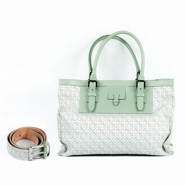 Bolso de mano y cinturón (36-90) de la firma LOEWE, realizado en tela canvas verde con el anagrama de la marca.
