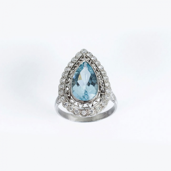 Delicada sortija lanzadera estilo art-decó, en platino, con aguamarina natural, talla perilla, orla y hombros en fila de limpios y blancos diamantes, talla brillante, en decoración grafilada
