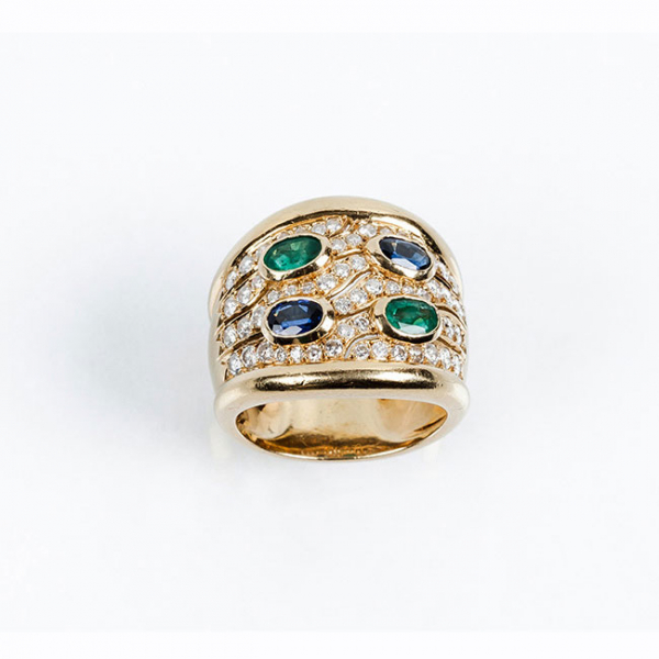 Sortija ancha en sólida montura de oro amarillo 18 K, con zafiros finos azules y esmeraldas talla oval, sobre bandas sinuosas de limpios y blancos diamantes talla brillante